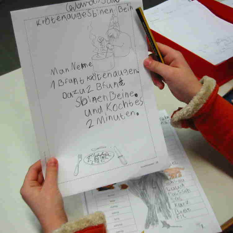 Eine Erstklässlerin erfindet auf diesem Geschichtenblatt (mit Vignette) ein grässliches Kochrezept. |