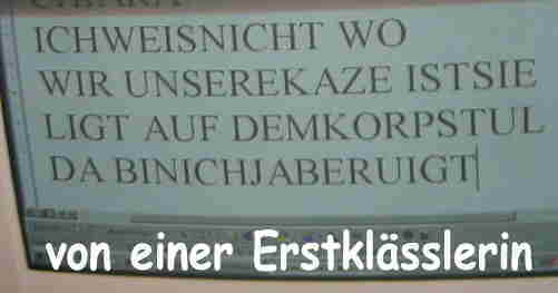 Der letzte Leseanfänger in der zweiten Klasse schreibt eins der "Erkennungswörter" für den Ablauf. All die Jahre sah es immer so aus, obwohl alle Kinder es vorher viele Male "richtig" geschrieben (abgeschrieben) hatten. Jetzt ist es die Eigenschöpfung. |
