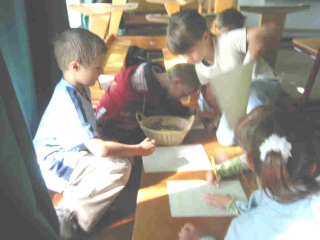 Das malende Team arbeitet heute mit Heißluftballons und Zeppelinen. Andere Kinder suchen zu den kopierten Blättern auf der Schulwiese die passenden Bäume. |