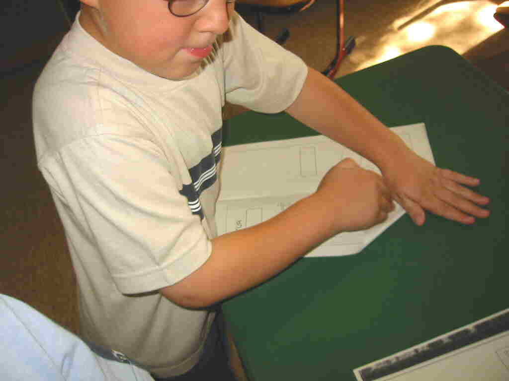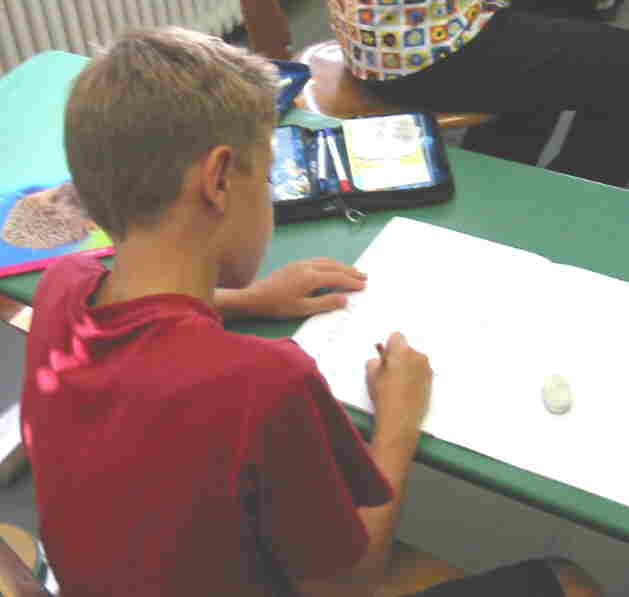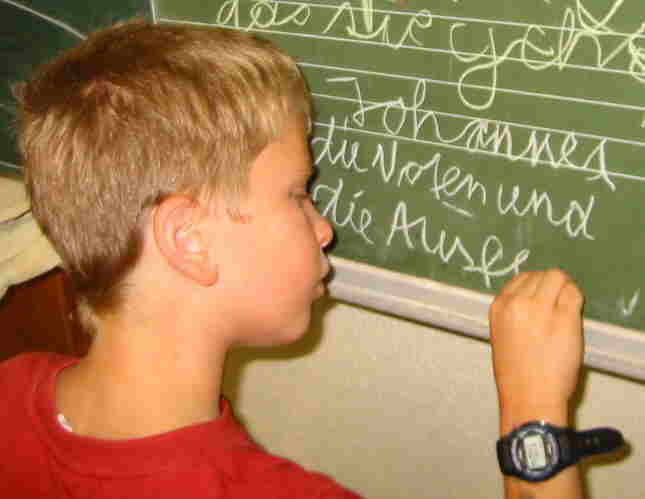 Zwischendurch schreibt er den informativen Text von der Tafel schön und fehlerlos ins Heft. |