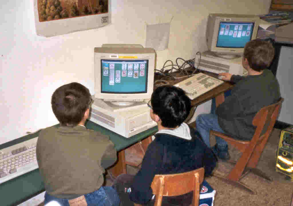 und andere Bücher, Lern- und Arbeitsblätter für jede Reichweite, inzwischen fünf Computer und natürlich Tische und Stühle, die die Kinder sich so einrichten, wie sie es brauchen. (Keine feste Sitzordnung. Schon gar nicht als "Galeere" oder Omnibus) Mädchen sitzen sich gerne gegenüber, Jungen üblicherweise nebeneinander. Wenn sich Jungen gegenüber sitzen, entsteht weniger Aggressivität. Seit ich Kinder selbstorganisiert lernen lasse, seit 1988, gab es in den Klassen für die ich zuständig war fast keine Unfälle. |