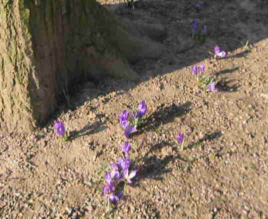 Krokusse am Fuß des Esskastanienbaums an der Schulwiese |