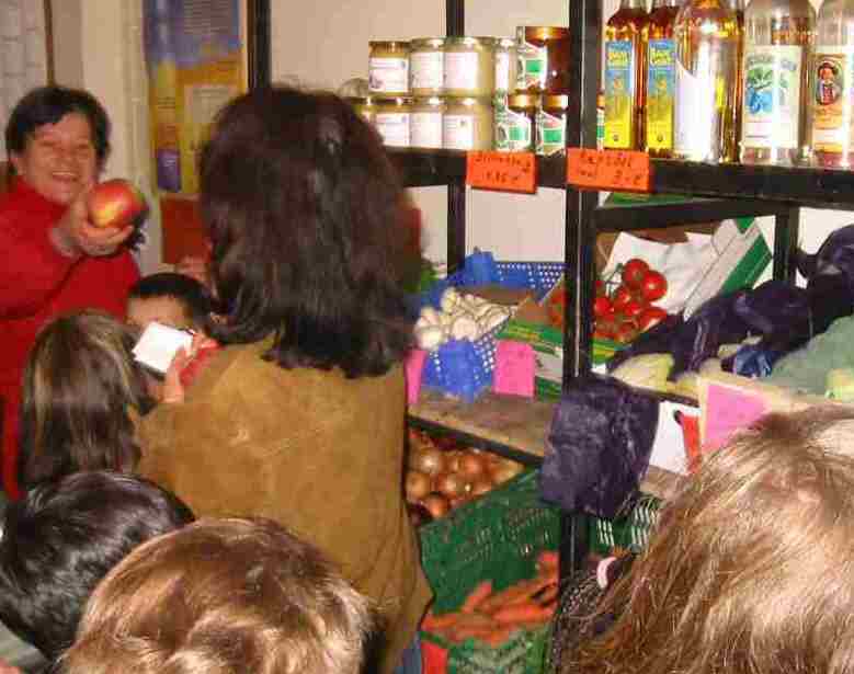 Mit der Ernährungsberaterin Frau Emami gehen die Kinder zum Hofladen. |
