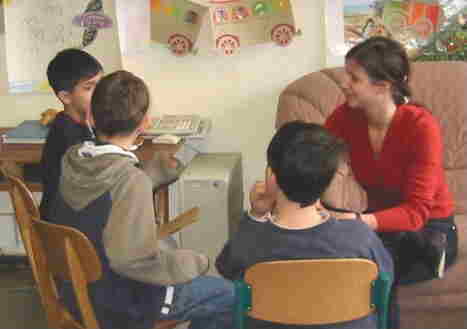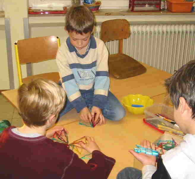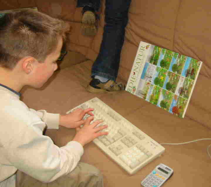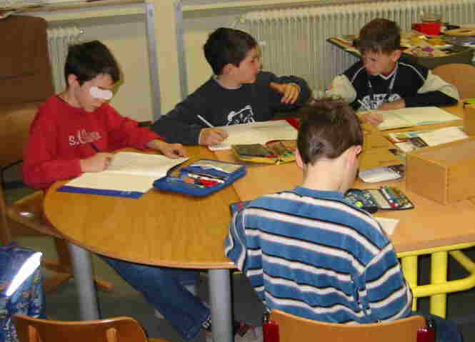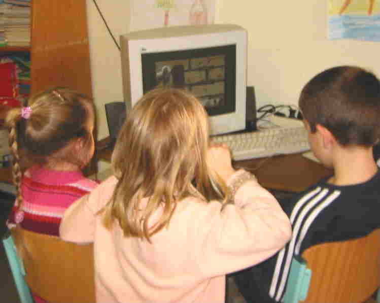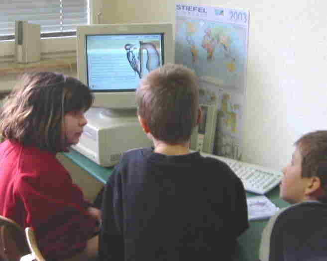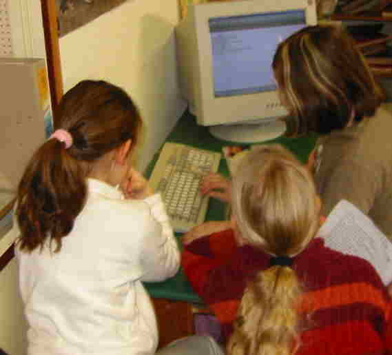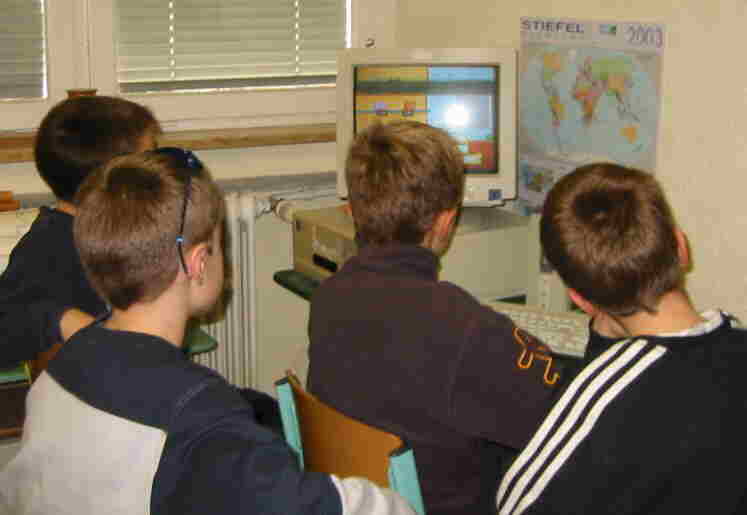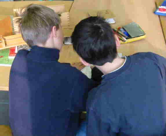 im Schulzimmer der Drittklässler am PC bei dem Programm Mittelalter. Sie bauen ein Fachwerkhaus zusammen. Niemand hat ihnen das "beigebracht". |