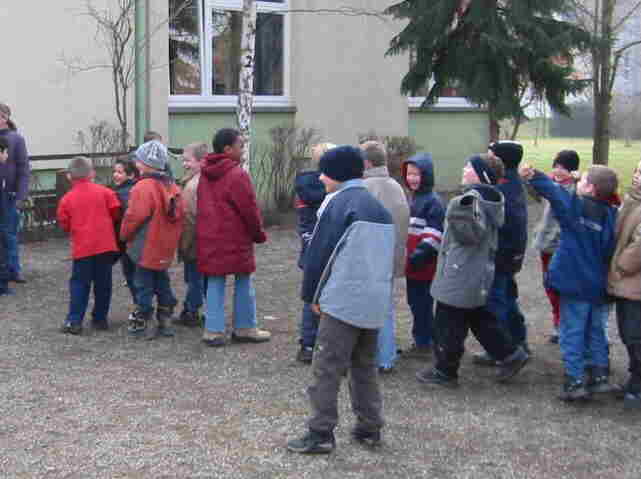 gemeinsame Aktion fast aller Kinder in der Hofpause: Wettlauf in Gegenrichtung um das Schulhaus herum |