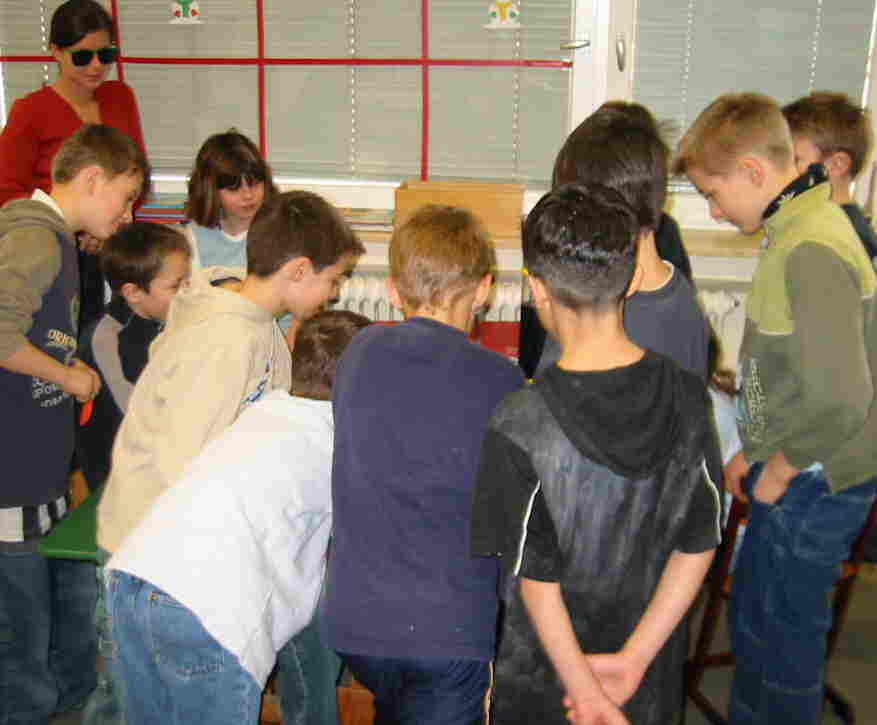 Ein Erstklässler entdeckt etwas im Zimmer der dritten Klasse. |