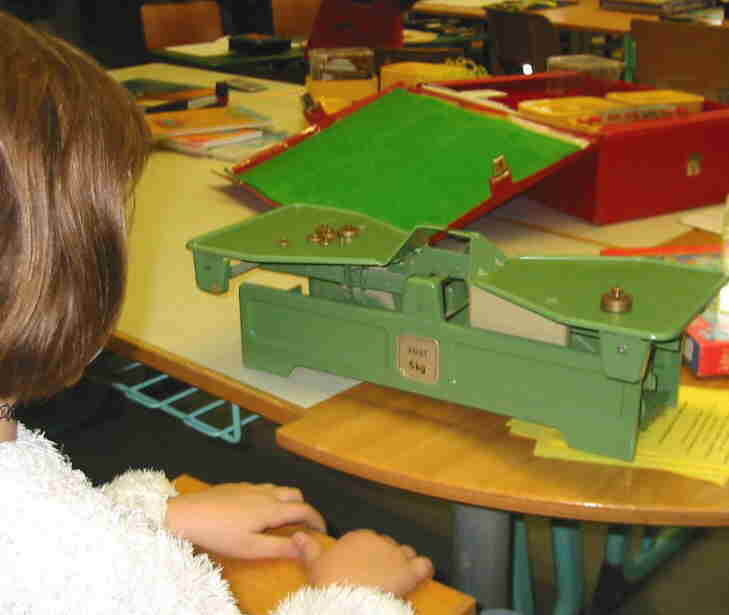 An der Tafel steht "wiegen". Die Balkenwaage ist im Schrank, der CVK-Koffer mit Waagen unter meinem Tisch. |
