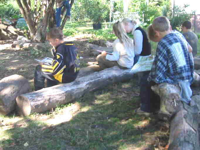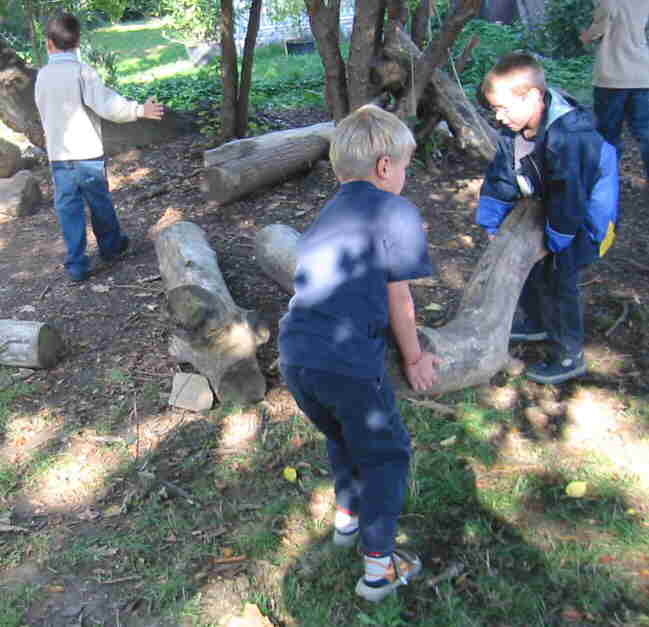 ![]() Dienstag hab ich Pausenaufsicht und kann zusehen bei den Aktivitäten am Holzhaufen. Zwei Erstklässler schleppen einen Baumstamm. |